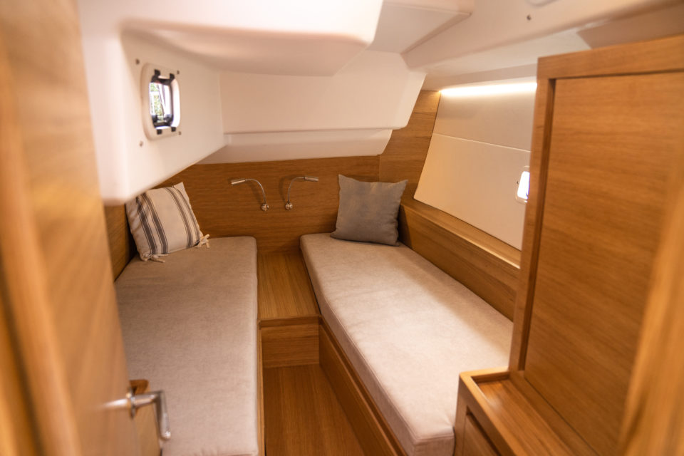 Además del espacioso cofre de velas en la proa, dos trampillas en el suelo de la cabina, detrás de las ruedas, dan acceso al enorme lazarette, donde se puede instalar un generador opcional de 5,5 kW.